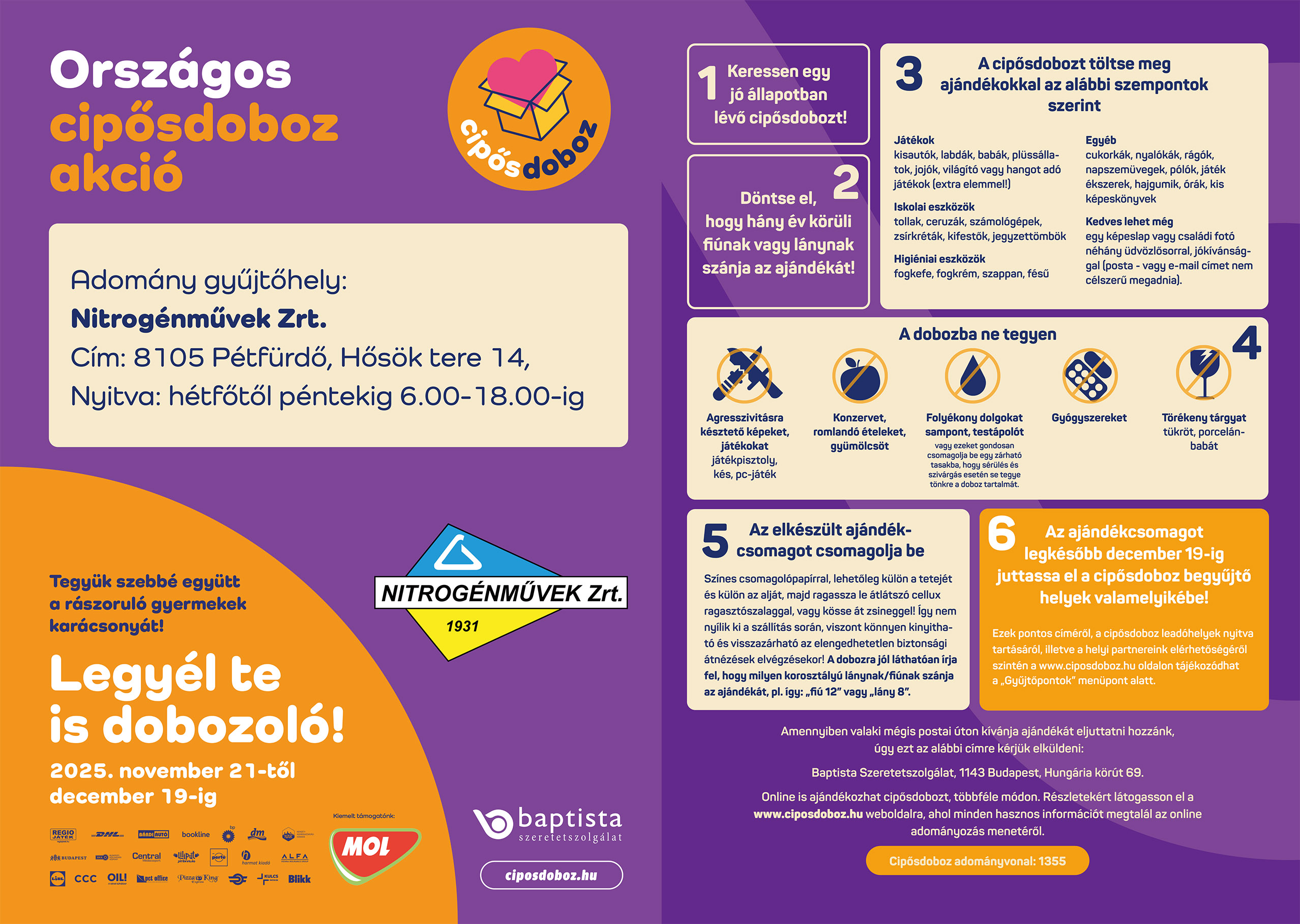 A Nitrogénművek Zrt. csatlakozott a Baptista Szeretetszolgálat által szervezett országos ajándékgyűjtő akcióhoz. Részletek a plakáton.